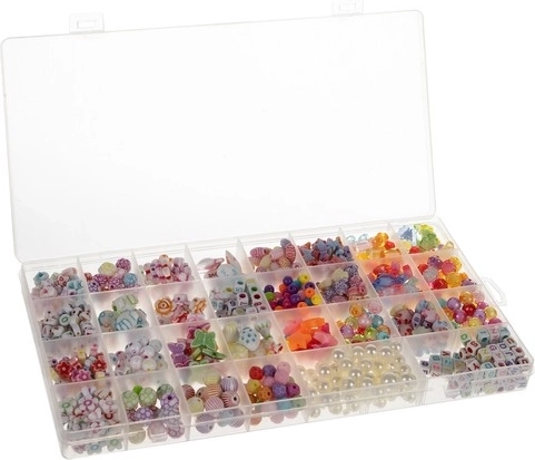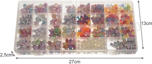 - Σετ XXL σε οργανωτή - 900 πολύχρωμα εξαρτήματα επιτρέπουν τη δημιουργία διαφόρων ειδών κοσμημάτων. Το σετ περιλαμβάνει επίσης στεφάνες, κορδόνι, κλεισίματα και συνδέσμους.