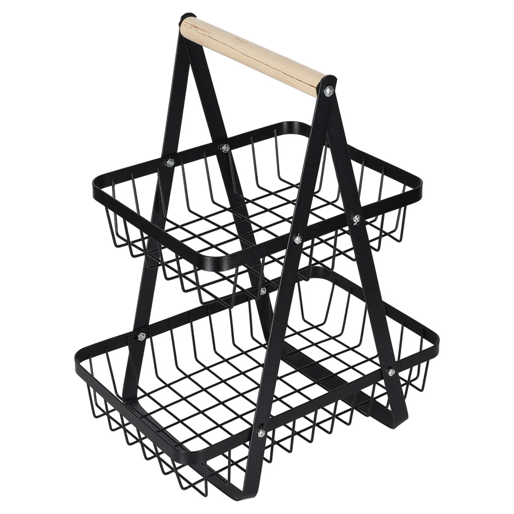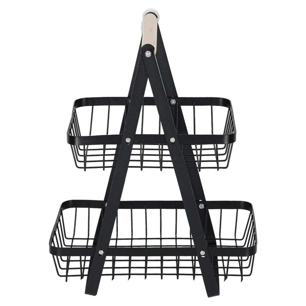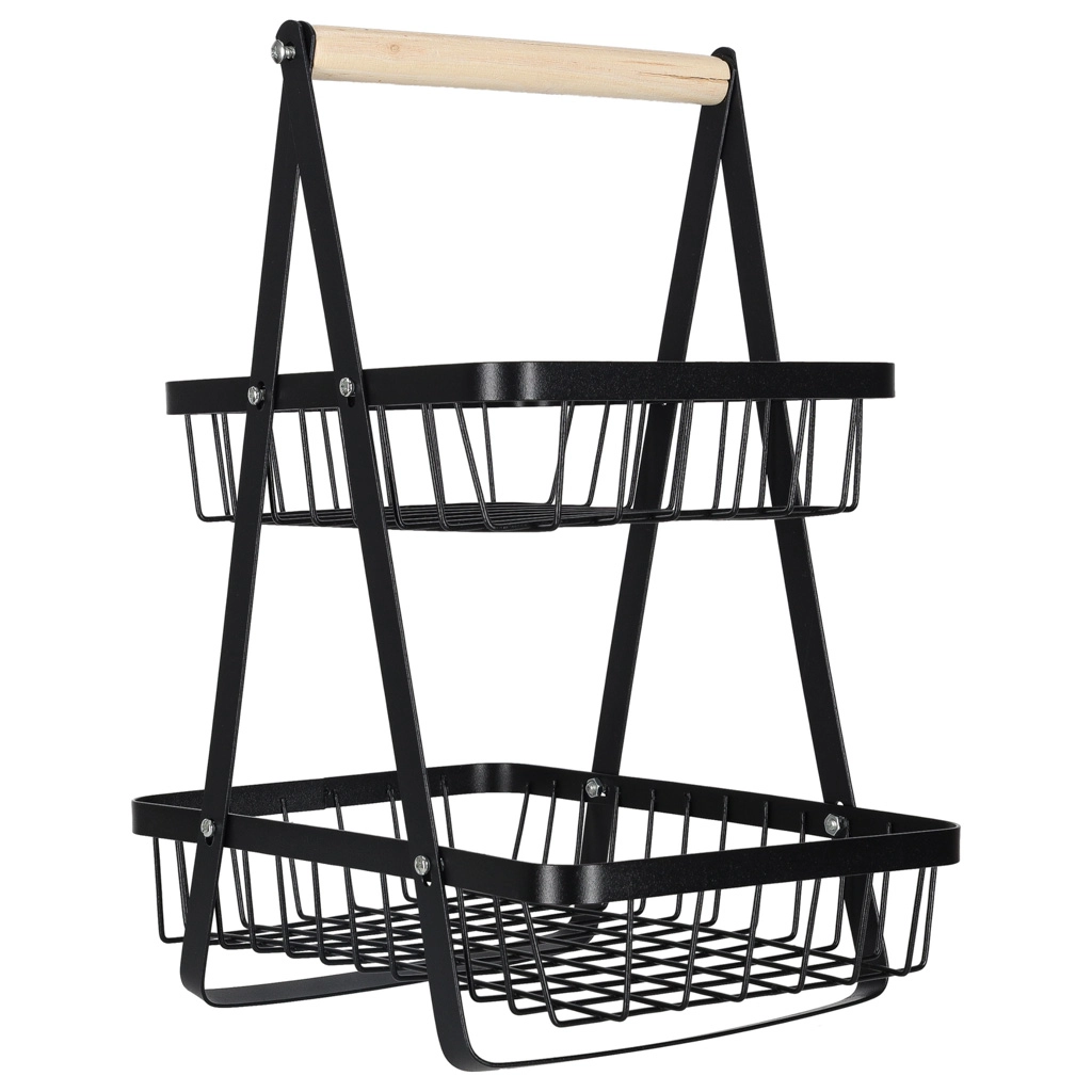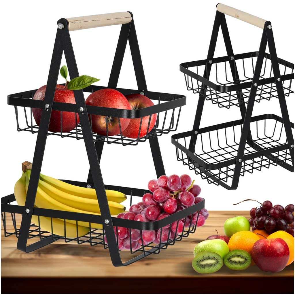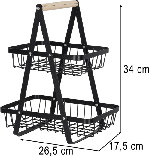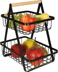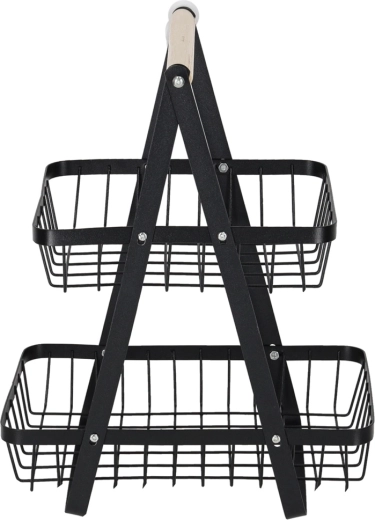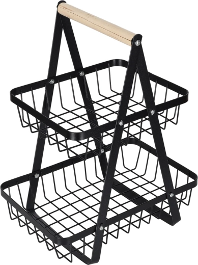Η ξύλινη λαβή επιτρέπει εύκολη μεταφορά όπου τη χρειάζεστε. Το μεγαλύτερο κάτω καλάθι είναι ιδανικό για μήλα, πορτοκάλια ή λαχανικά, ενώ το μικρότερο επάνω για μπανάνες, εσπεριδοειδή ή μικροαντικείμενα. Η ανθεκτική μεταλλική κατασκευή εξασφαλίζει σταθερότητα και μεγάλη διάρκεια ζωής.