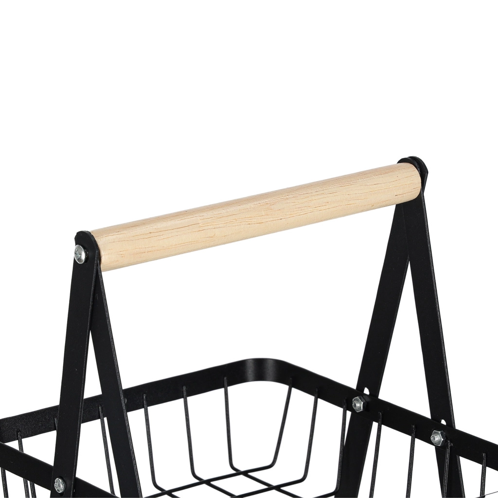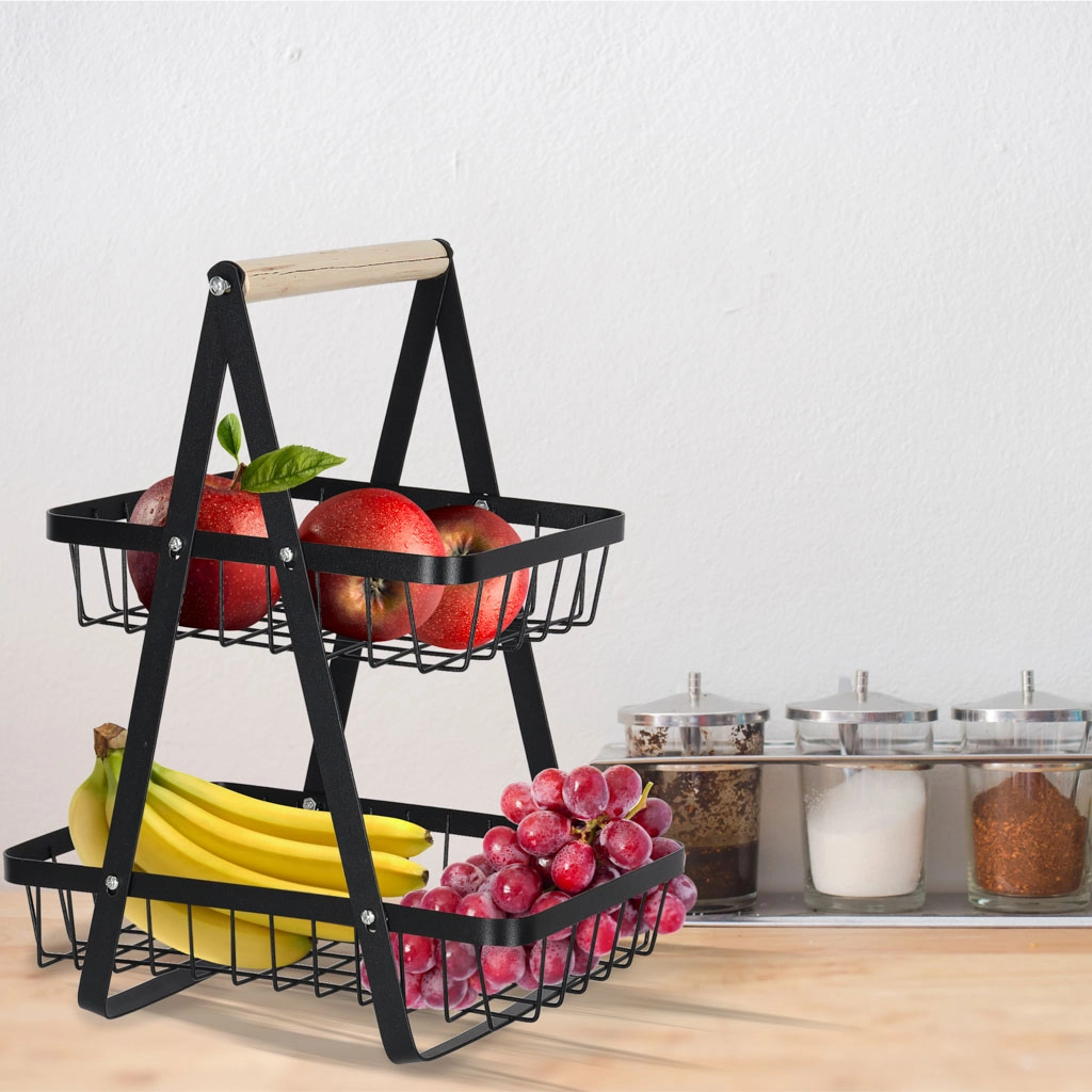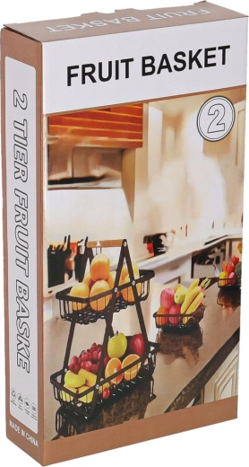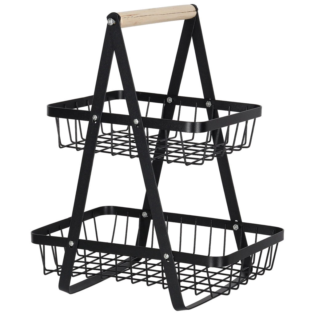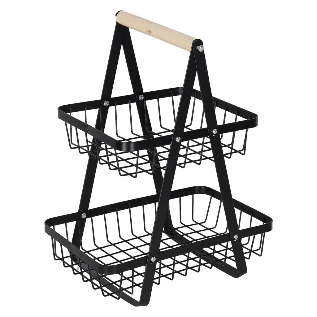 Η ξύλινη λαβή επιτρέπει εύκολη μεταφορά όπου τη χρειάζεστε. Το μεγαλύτερο κάτω καλάθι είναι ιδανικό για μήλα, πορτοκάλια ή λαχανικά, ενώ το μικρότερο επάνω για μπανάνες, εσπεριδοειδή ή μικροαντικείμενα. Η ανθεκτική μεταλλική κατασκευή εξασφαλίζει σταθερότητα και μεγάλη διάρκεια ζωής.