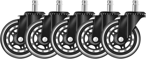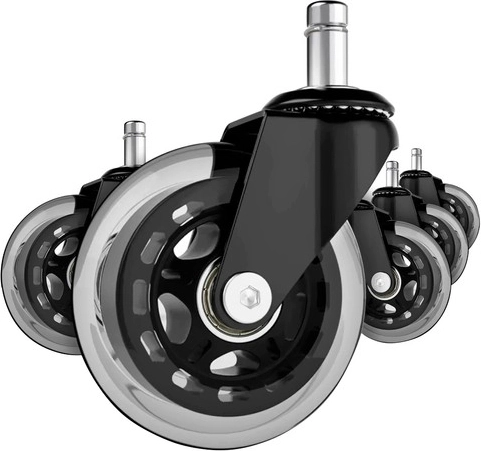 Σετ πέντε τροχακίων κατάλληλο για καρέκλες γραφείου, gaming, περιστρεφόμενες ή παιδικές, συμβατό με τις περισσότερες καρέκλες της αγοράς με άξονα διαμέτρου 11 mm.