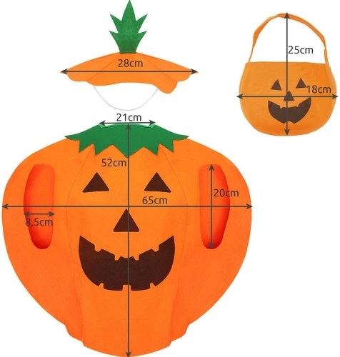 Σας παρουσιάζουμε την ιδανική παιδική στολή κολοκύθας για το Halloween. Αυτό το σετ είναι ευέλικτο χάρη στις διαστάσεις του και ταιριάζει χωρίς πρόβλημα τόσο σε μικρότερα όσο και σε μεγαλύτερα παιδιά. Είναι ιδανικό για γιορτινές περιστάσεις και η άνεσή του ηρεμεί κάθε παιδί.