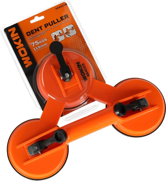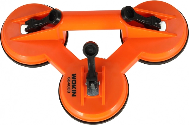 Επαγγελματική τριπλή κενό-βεντούζα WOKIN με αντοχή φορτίου 75 kg διευκολύνει την ασφαλή μεταφορά και τον ακριβή χειρισμό γυαλιού, υαλώσεων και μεγάλων πλακιδίων. Τρία σημεία αναρρόφησης διαμέτρου 11,5 cm εξασφαλίζουν σταθερό κράτημα χωρίς να γρατζουνίζεται η επιφάνεια, ενώ η εργονομική λαβή προσφέρει ακριβή χειρισμό και μεγαλύτερη άνεση εργασίας.