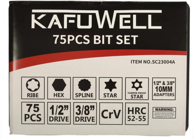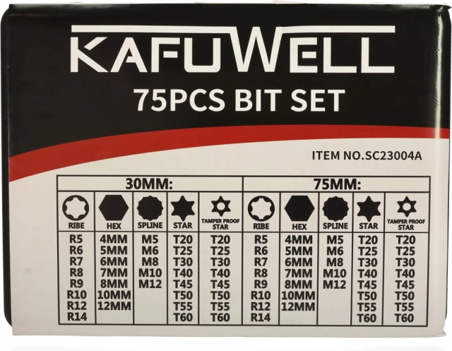 Καθολικό σετ μπιτ KAFUWELL με 75 τεμάχια που συνδυάζει ισχύ και ακρίβεια για εργαστήρι και σπίτι. Ανθεκτικά μπιτ από κράμα CrV, σε κοντή και μακριά εκδοχή, τύποι HEX, RIBE, SPLINE, TORX και TORX Security και επιπλέον 3 αντάπτορες 1/2" και 3/8". Το ευανάγνωστο πρακτικό βαλιτσάκι μεταφοράς διατηρεί την τάξη και διευκολύνει τη μετακίνηση.