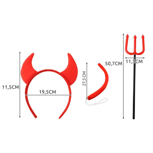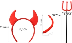 Πλήρης στολή μικρού διαβόλου για παιδιά και ενήλικες με 4 αξεσουάρ: κέρατα σε στεφάνι, παπιγιόν, ουρά και τρίαινα. Το ενιαίο μέγεθος με ελαστικά λαστιχάκια εξασφαλίζει άνετη εφαρμογή. Ιδανική επιλογή για Halloween, καρναβάλι, πάρτι γενεθλίων ή θεματικές εκδηλώσεις – δημιουργήστε σε δευτερόλεπτα εντυπωσιακή και διασκεδαστική εμφάνιση.