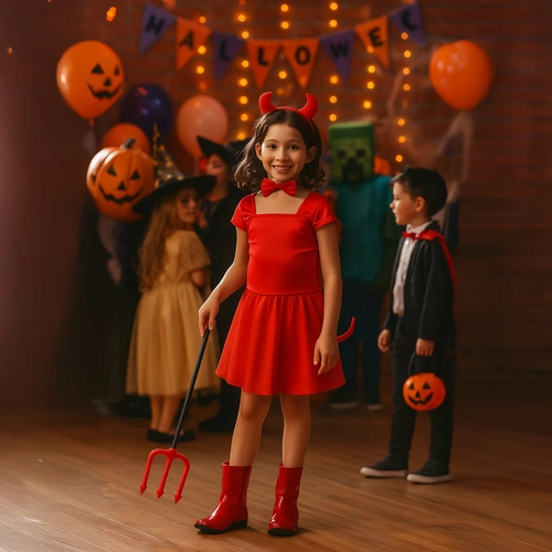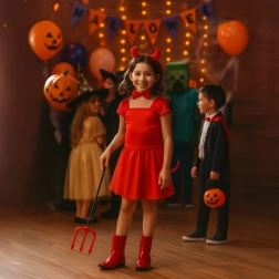 Στυλάτη στολή διαβόλου σε έντονο κόκκινο που μεταμορφώνει κάθε παιδί ή ενήλικα στη στιγμή. Χάρη στα μαλακά υλικά και τις ελαστικές βάσεις, τα αξεσουάρ φοριούνται εύκολα και μένουν άνετα καθ’ όλη τη διάρκεια της διασκέδασης. Το σετ είναι ιδανικό για παιχνίδι ρόλων στο σπίτι, σχολικές γιορτές, φωτογραφίσεις και πάρτι.