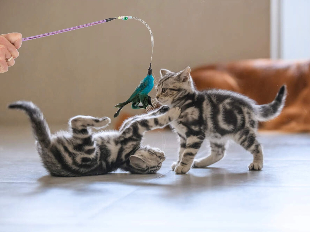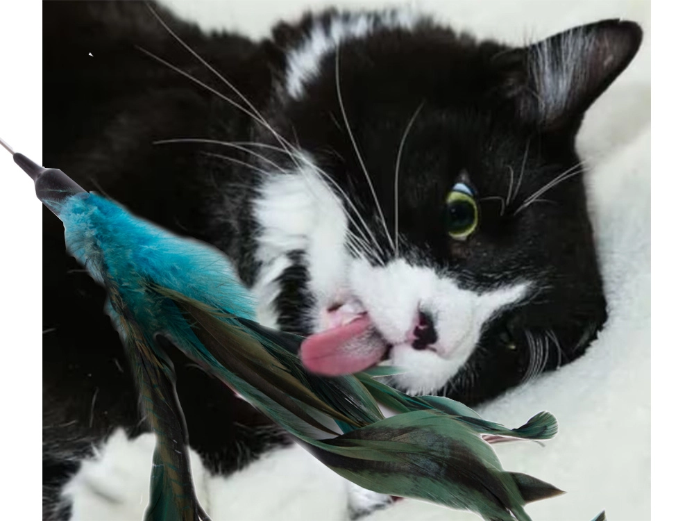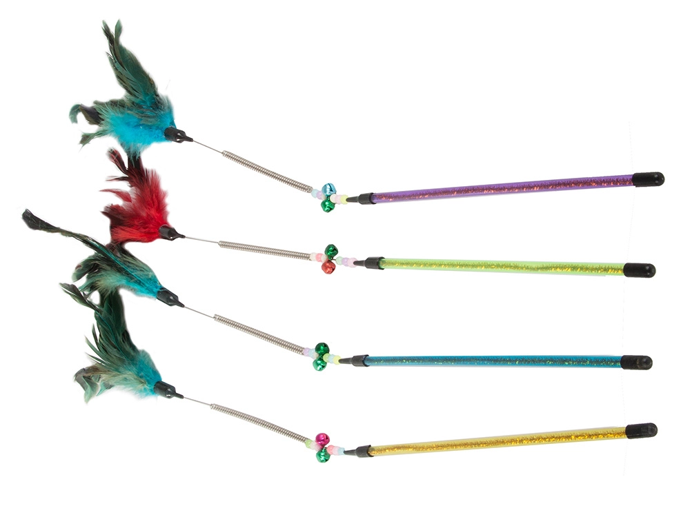 Τα πολύχρωμα φτερά είναι μαλακά και προσελκύουν τις γάτες σε αλληλεπίδραση.