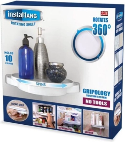 Το ράφι περιστρέφεται κατά 360°, ώστε να βρίσκετε γρήγορα αυτό που χρειάζεστε. Η εγκατάσταση γίνεται σε λίγα λεπτά – χωρίς τρύπημα και εργαλεία, αρκεί να πιέσετε τη λαβή και να το τοποθετήσετε εκεί όπου θέλετε να αξιοποιήσετε κάθε εκατοστό χώρου. Τα ενσωματωμένα γαντζάκια προσφέρουν επιπλέον χώρο για να κρεμάσετε πετσέτες, πανάκια ή σφουγγάρια μπάνιου.
