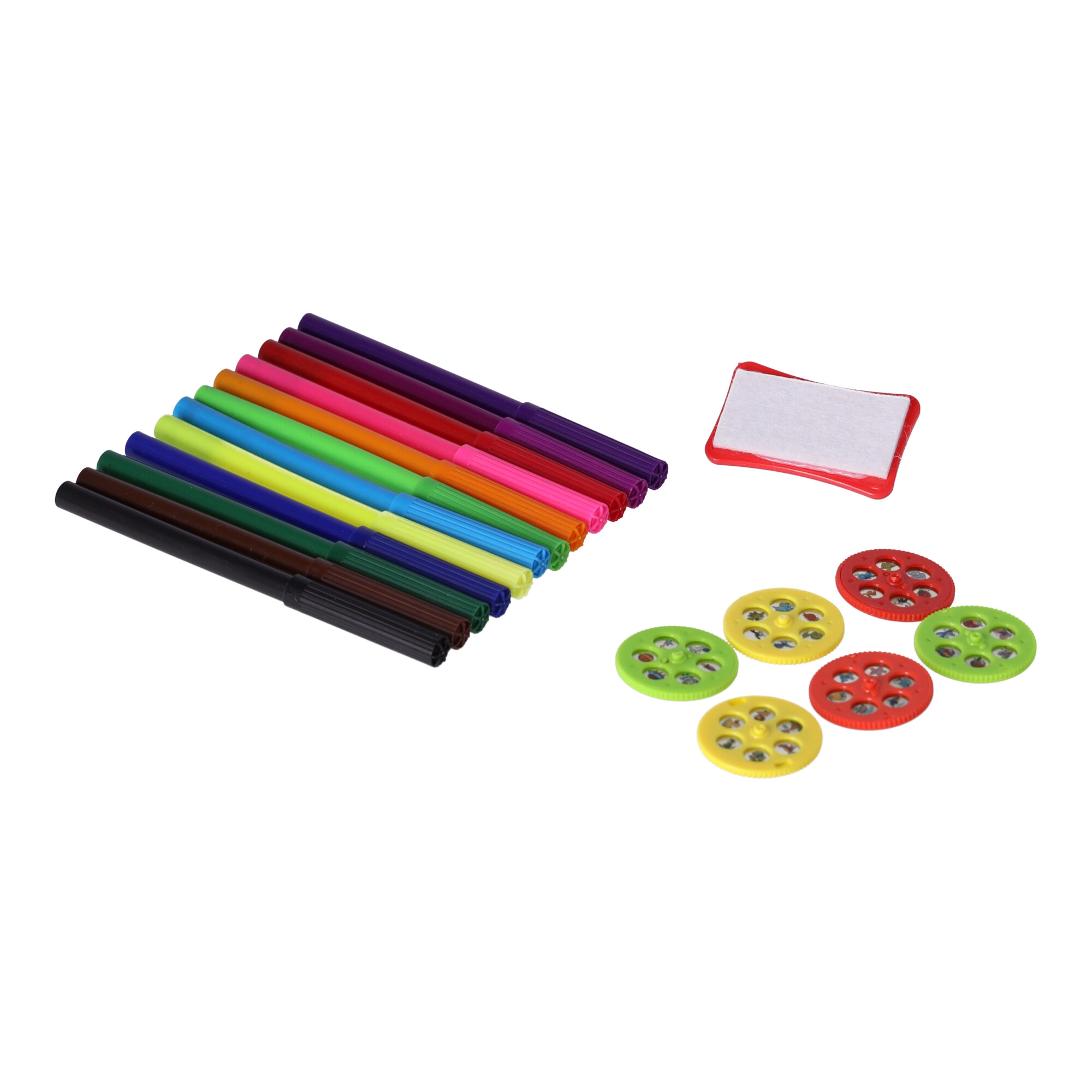 Στη συσκευασία θα βρείτε 6 δίσκους με σχέδια, 12 χρωματιστούς μαρκαδόρους, χαρτί και γόμα. Τα παιδιά μπορούν να δημιουργήσουν αμέσως μετά το άνοιγμα.