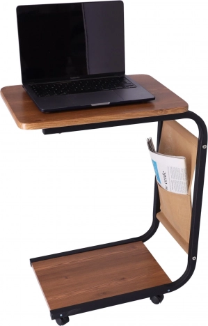 Πρακτικό και κομψό κινητό τραπεζάκι με σκούρα ξύλινη επιφάνεια και μεταλλικό σκελετό με ροδάκια, ιδανικό ως τραπεζάκι καναπέ, εργασιακό τραπεζάκι για φορητό υπολογιστή και τραπεζάκι σερβιρίσματος για καφέ. Χάρη στις συμπαγείς διαστάσεις, την εύκολη μετακίνηση και την πλαϊνή θήκη για περιοδικά ή έγγραφα, ταιριάζει άψογα σε σαλόνι, κρεβατοκάμαρα και γραφείο.