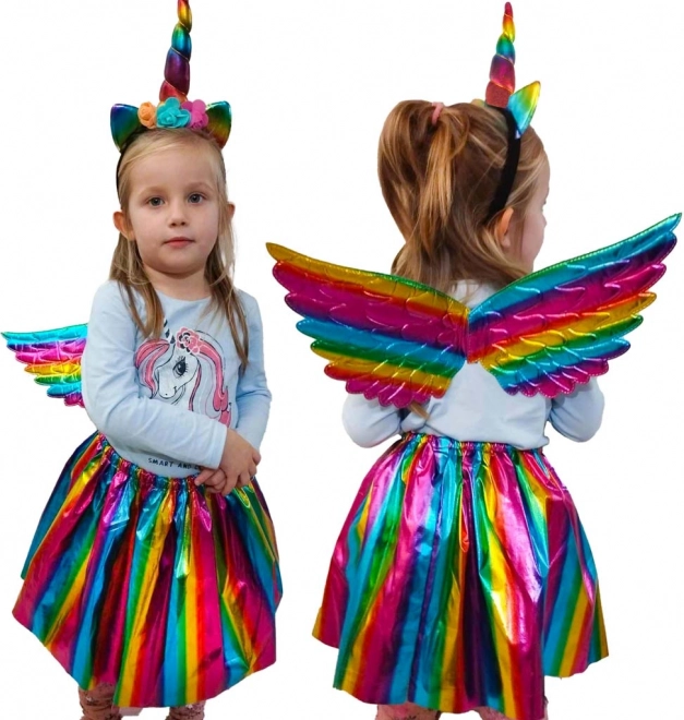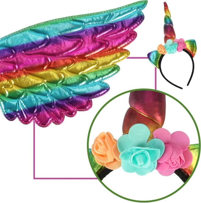 Στη συσκευασία θα βρείτε ό,τι χρειάζεστε - ουράνιο τόξο φτερά, στέκα με κέρας και φούστα, ιδανικά για κάθε γιορτή.