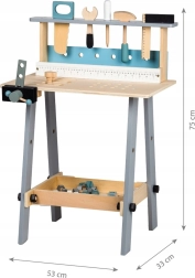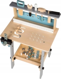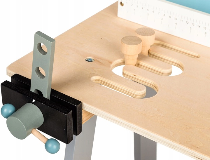 Περιλαμβάνει πρακτική μέγγενη, επιφάνεια εργασίας με οπές και μέτρο, καθώς και ράφι για αποθήκευση εργαλείων. Το φυσικό ξύλο σε συνδυασμό με απαλούς τόνους ταιριάζει σε κάθε παιδικό δωμάτιο και ενθαρρύνει το δημιουργικό και μιμητικό παιχνίδι.