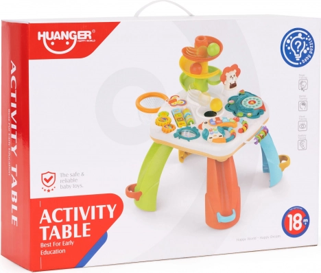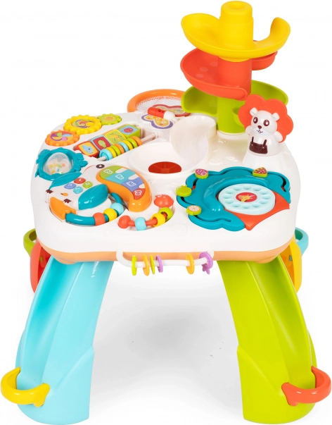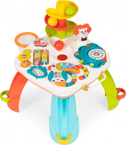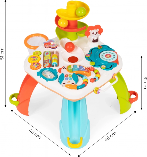 Το εκπαιδευτικό τραπεζάκι δεν είναι μόνο ένας υπέροχος τρόπος για δημιουργική απασχόληση, αλλά και για στήριξη της ανάπτυξης του παιδιού. Το παιχνίδι διαθέτει πολλά διαδραστικά στοιχεία, όπως μουσικό τούκαν, κουδουνίστρα, χρωματιστές χάντρες, περιστρεφόμενα παιχνίδια και τηλεφωνικό δίσκο, που βοηθούν στην ανάπτυξη λεπτής κινητικότητας και συντονισμού.