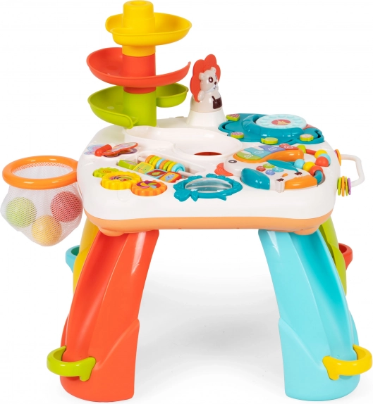Το τραπέζι περιλαμβάνει επίσης τσουλήθρα με μπαλάκια που ενθαρρύνει τον πειραματισμό και αναπτύσσει γνωστικές δεξιότητες όπως η κατανόηση αιτίας-αποτελέσματος και ο χωρικός συλλογισμός.