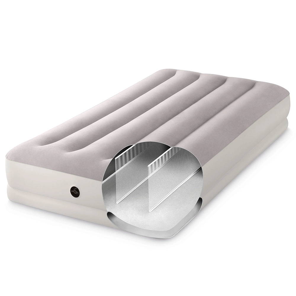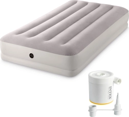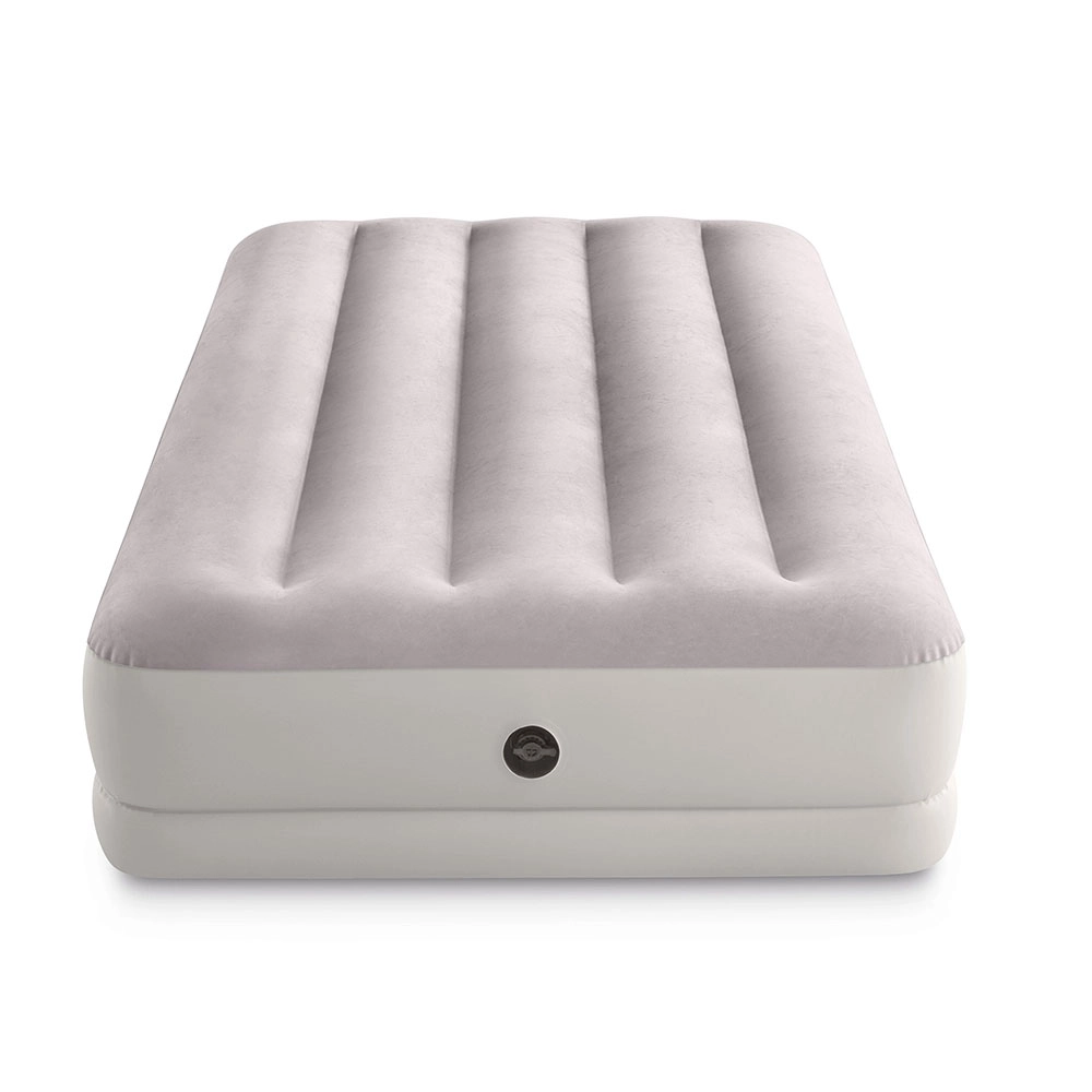 Το φουσκωτό κρεβάτι INTEX συνδυάζει ανθεκτικό υλικό PVC με απαλή flock βελούδινη επιφάνεια, η οποία είναι ευχάριστη στην αφή και βελτιώνει την άνεση ύπνου. Η υπερυψωμένη κατασκευή με διαμήκη κανάλια και εσωτερικές ενισχύσεις εξασφαλίζει σταθερότητα χωρίς φαινόμενο «κούνιας» και αξιόπιστη στήριξη της σπονδυλικής στήλης.