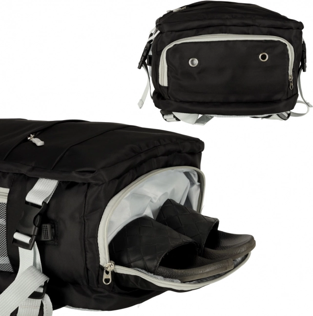 Μεγάλο αδιάβροχο ταξιδιωτικό σακίδιο, κατάλληλο για καθημερινή μεταφορά αλλά και ως χειραποσκευή. Διαθέτει ιμάντες συμπίεσης που επιτρέπουν τη μείωση του όγκου όταν είναι γεμάτο. Χάρη στον μεγάλο αριθμό τσεπών μπορείτε να οργανώσετε τα αντικείμενά σας όπως χρειάζεστε, συμπεριλαμβανομένης ειδικής τσέπης για παπούτσια. Το προϊόν περιλαμβάνει θύρα USB και καλώδιο για εύκολη φόρτιση κινητών συσκευών απευθείας από power bank μέσα στο σακίδιο.