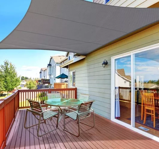 Η τέντα σκίασης είναι κατασκευασμένη από ποιοτικό υλικό που μπλοκάρει αποτελεσματικά τις ηλιακές ακτίνες και μειώνει τη θερμοκρασία κάτω από την τέντα.