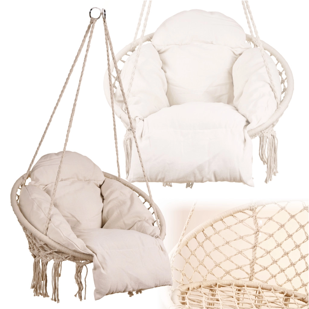 Απολαύστε τον απόλυτο χαλαρωτικό χρόνο σε κρεμαστή πολυθρόνα τύπου «φωλιά πελαργού» με απαλό μαξιλάρι. Η στιβαρή κατασκευή, η αντοχή 150 kg και η διάμετρος 80 cm προσφέρουν άνεση και σταθερότητα. Η διαχρονική απόχρωση εκρού ταιριάζει σε κήπο, βεράντα, μπαλκόνι και εσωτερικούς χώρους.