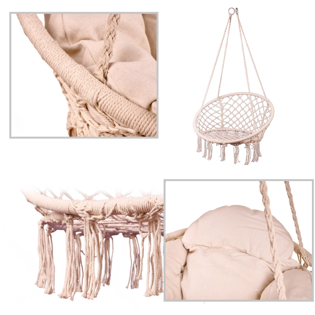 Αυτή η κρεμαστή αιώρα-πολυθρόνα προσφέρει άνετο κάθισμα για στιγμές ξεκούρασης και απαλή αιώρηση. Το μεγάλο κυκλικό σχήμα και το απαλό μαξιλάρι υποστηρίζουν εργονομική στάση σώματος, ενώ τα ανθεκτικά βαμβακερά σχοινιά και ο μεταλλικός σκελετός προσφέρουν σιγουριά και μεγάλη διάρκεια ζωής.