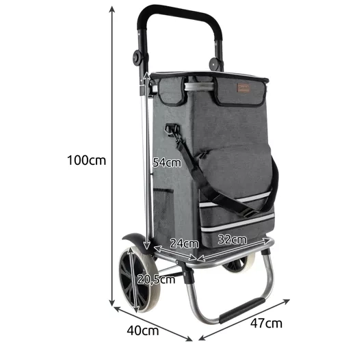 Η τσάντα είναι από ανθεκτικό, αδιάβροχο υλικό με αλουμινένια θερμική μεμβράνη για μεγαλύτερη φρεσκάδα τροφίμων. Χάρη στον αποσπώμενο ιμάντα ώμου μεταφέρεται και εκτός πλαισίου, ενώ η πρακτική μπροστινή τσέπη διευκολύνει την άμεση πρόσβαση σε μικροαντικείμενα. Ολόκληρο το καρότσι διπλώνει σε συμπαγείς διαστάσεις για εύκολη αποθήκευση στο σπίτι ή στο πορτμπαγκάζ.