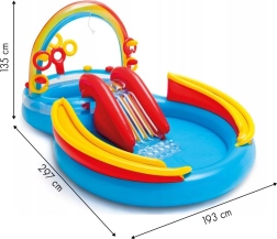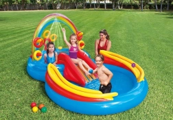 Το φουσκωτό υδάτινο πάρκο Intex συνδυάζει ρηχή πισίνα, τσουλήθρα και διαδραστικά στοιχεία σε ένα πολύχρωμο κέντρο διασκέδασης. Η αψίδα ουράνιου τόξου με ψεκασμό δημιουργεί μια δροσιστική υδάτινη κουρτίνα, στην οποία τα παιδιά γλιστρούν με ασφάλεια προς μια μαλακή επιφάνεια προσγείωσης. Οι δύο υδάτινες ζώνες με διαφορετικό βάθος είναι ιδανικές για διάφορες ηλικίες.