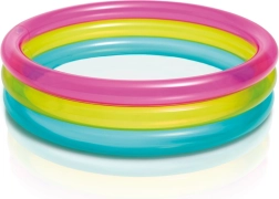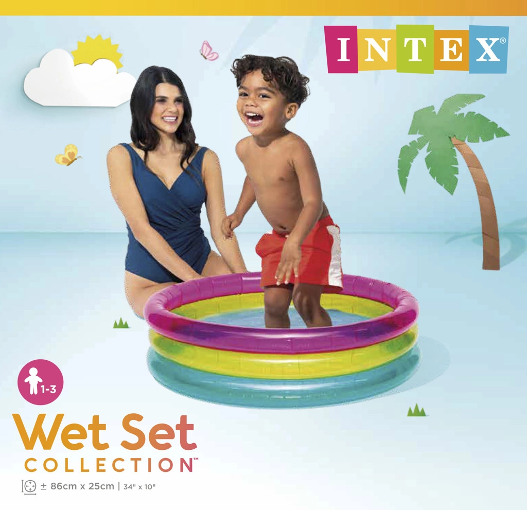 Η φουσκωτή παιδική πισίνα INTEX Rainbow είναι πολύχρωμη και πρακτική για τις καλοκαιρινές μέρες. Χάρη στους τρεις διαφανείς δακτυλίους είναι σταθερή και άνετη, ενώ οι συμπαγείς διαστάσεις 86 × 25 cm χωρούν στους περισσότερους κήπους, βεράντες και μπαλκόνια. Η χωρητικότητα 68 λίτρων με προτεινόμενο ύψος στάθμης 17 cm εξασφαλίζει μια ασφαλή, ρηχή υδάτινη επιφάνεια για νήπια.
