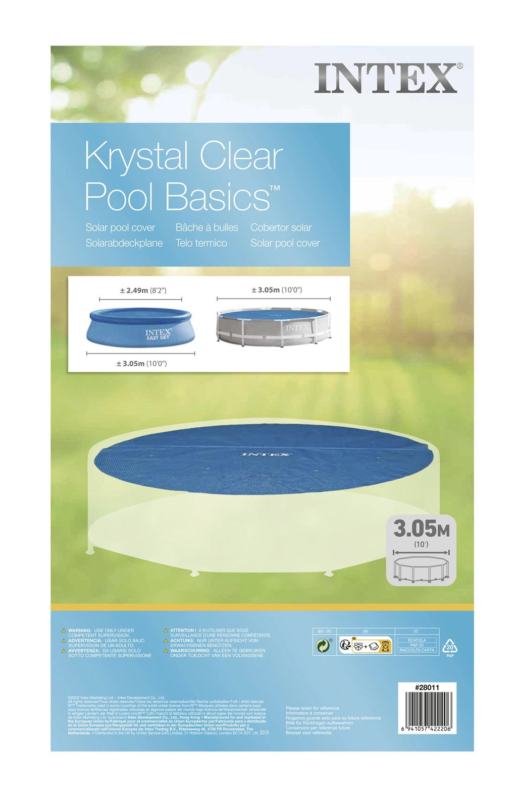 Πρακτικό ηλιακό κάλυμμα INTEX για στρογγυλές πισίνες διαμέτρου 305 cm που ζεσταίνει και διατηρεί τη θερμοκρασία του νερού, ενώ ταυτόχρονα μειώνει τις θερμικές απώλειες τη νύχτα και προστατεύει την επιφάνεια από φύλλα και ρύπους. Χάρη στη δομή με φυσαλίδες επιτρέπει τη διέλευση των ηλιακών ακτίνων και βελτιώνει τη μόνωση του νερού.