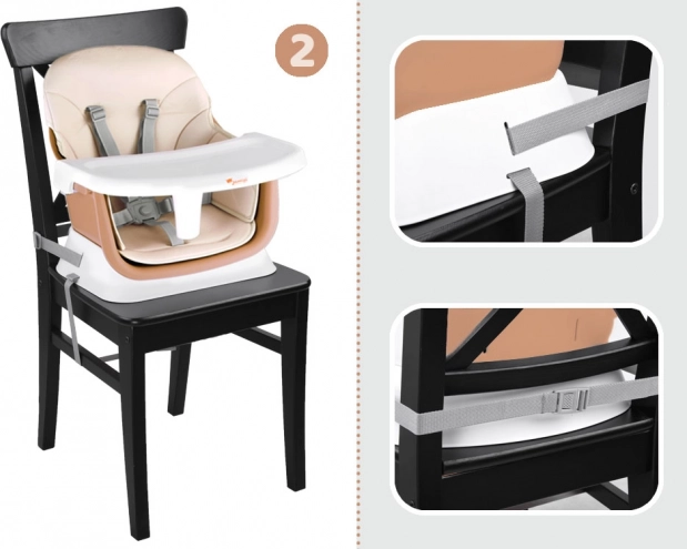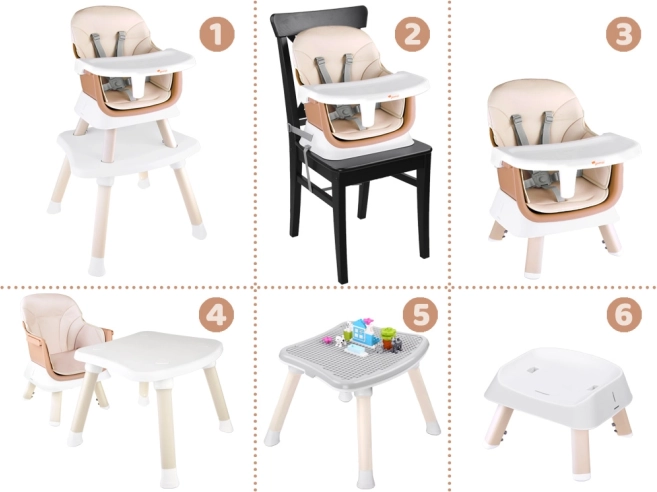 - 6 λειτουργίες σε μία: ψηλή καρέκλα, προσαρμογέας σε καρέκλα τραπεζιού, χαμηλή καρέκλα με δίσκο, καρέκλα με τραπεζάκι, τραπεζάκι με επιφάνεια για τουβλάκια, χαμηλό σκαμπό