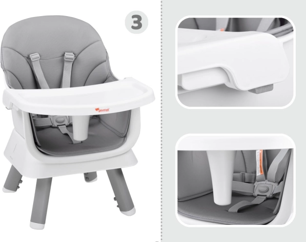 Πρακτικό παιδικό καρεκλάκι φαγητού 6 σε 1 που «μεγαλώνει» με το παιδί σας από 6 μηνών. Προσφέρει αρθρωτή κατασκευή, ασφαλείς ζώνες 5 σημείων, εύκολα πλενόμενο και διαπνέον ύφασμα επένδυσης, αποσπώμενο δίσκο και αντιολισθητικά ποδαράκια. Χάρη στις διαφορετικές διαμορφώσεις λειτουργεί ως ψηλό και χαμηλό καρεκλάκι, αντάπτορας για καρέκλα τραπεζαρίας, ανεξάρτητο καρεκλάκι με τραπεζάκι και τραπέζι παιχνιδιού για τουβλάκια.