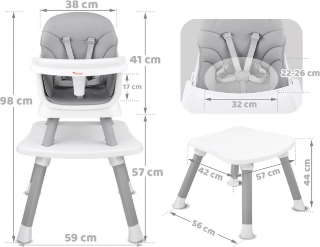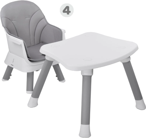 - 6 σε 1: ψηλό καρεκλάκι με δίσκο, αντάπτορας για καρέκλα τραπεζαρίας, χαμηλό καρεκλάκι με δίσκο, καρεκλάκι + τραπεζάκι, τραπέζι παιχνιδιού με επιφάνεια για τουβλάκια, χαμηλό σκαμπό/ταμπουρέ