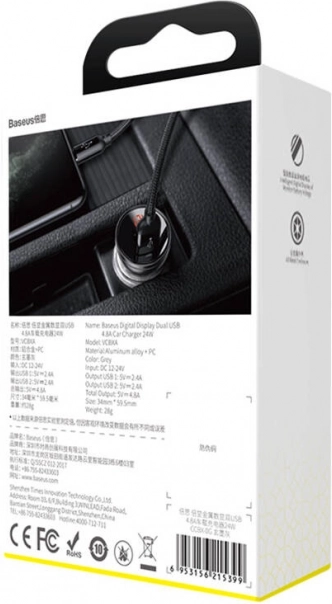Ο φορτιστής αυτοκινήτου Baseus έχει σχεδιαστεί για αποδοτική και γρήγορη φόρτιση των συσκευών σας, ακόμα και κατά τη διάρκεια του ταξιδιού. Με ισχύ 4,8 A και δύο θύρες USB, επιτρέπει ταυτόχρονη φόρτιση έως και δύο συσκευών χωρίς ανησυχία για αργή φόρτιση.