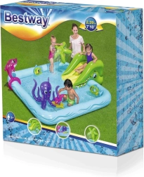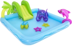 Ζωντανέψτε τον κήπο με το παιδικό φουσκωτό υδάτινο πάρκο BESTWAY με θέμα το θαλάσσιο ενυδρείο. Προσφέρει αφαιρούμενη τσουλήθρα, υδάτινο σιντριβάνι με σύνδεση λάστιχου και πολλά φουσκωτά παιχνίδια (δελφίνι, χταπόδι, ψαράκια και αστερίες) για ώρες διασκέδασης στις ζεστές μέρες. Ανθεκτικό PVC, βαλβίδες ασφαλείας και εύκολη αποστράγγιση του νερού για άνετη και ασφαλή χρήση.