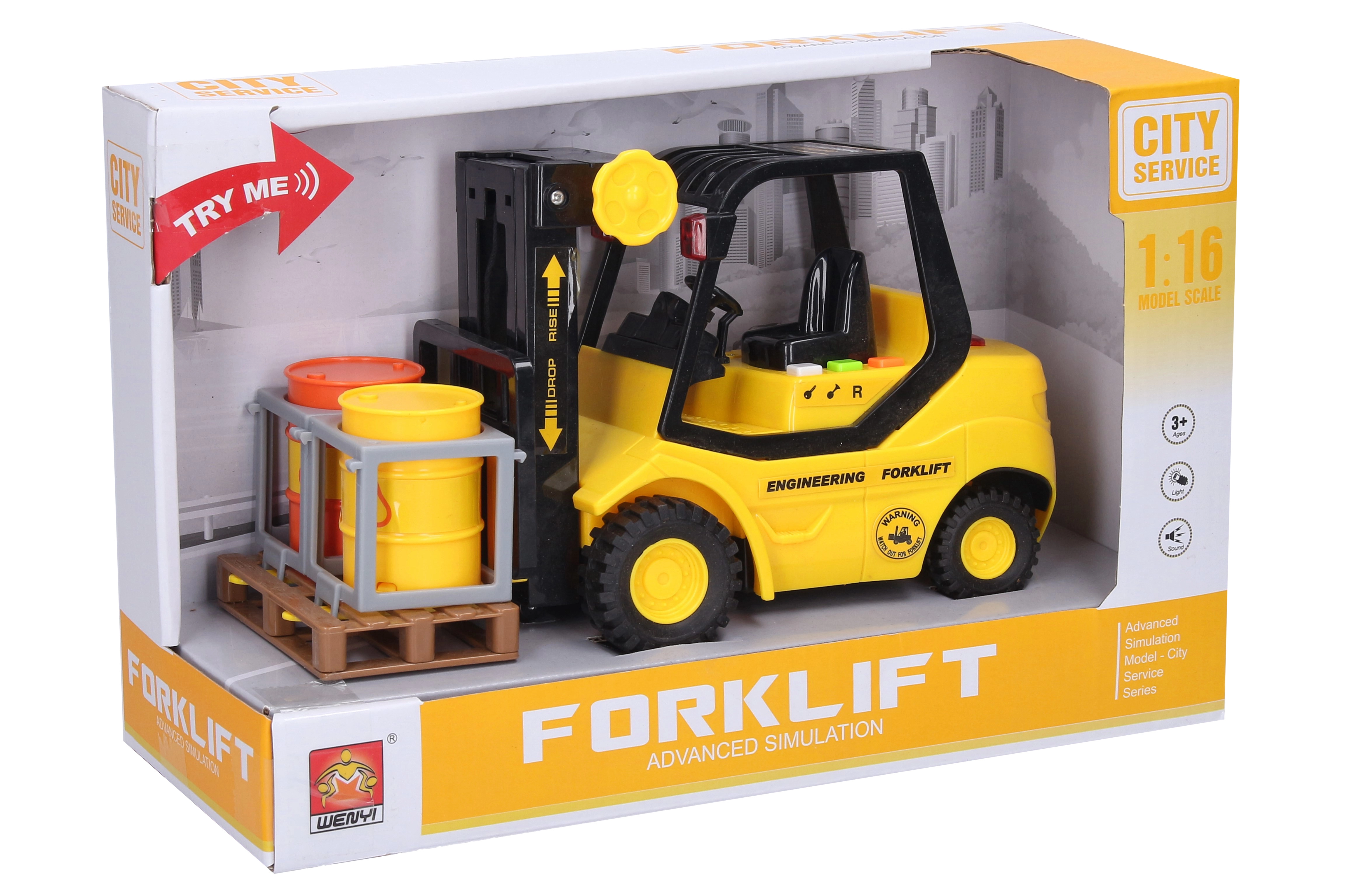 Το κίτρινο-μαύρο περονοφόρο ανυψωτικό είναι το ιδανικό συμπλήρωμα για κάθε παιδική συλλογή παιχνιδιών. Αυτό το μοντέλο είναι σχεδιασμένο για επιδέξιους οδηγούς που θα εκτιμήσουν το κινητό εμπρός τμήμα του, κατάλληλο για την ανύψωση παλετών.