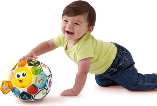 Χάρη στις δυνατότητές της, η μπάλα μπορεί να κυλά μπροστά στα παιδιά, τραβώντας την προσοχή τους και παρακινώντας τα να παρατηρούν, να μπουσουλούν και να παίζουν. Αυτή η πολύχρωμη μπάλα ποδοσφαίρου με ποικίλες υφές και ηχητικά εφέ όχι μόνο αναπτύσσει τις αισθήσεις, αλλά παρέχει επίσης απτική διέγερση χάρη στο απαλό βελούδινο κάλυμμα. Τα φωτεινά και ηχητικά εφέ, σε συνδυασμό με το φωτεινό προσωπάκι και τα πορτοκαλί κουμπιά, συμβάλλουν στην αναγνώριση των χρωμάτων.