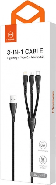 Ένα καλώδιο, τρεις σύνδεσμοι – με USB‑C, Lightning και Micro USB καλύπτετε την πλειονότητα των σύγχρονων συσκευών: smartphones, tablets, ασύρματα ακουστικά ή power banks. Το καλώδιο μπορεί να τροφοδοτήσει έως τρεις συσκευές ταυτόχρονα, εξοικονομώντας χώρο και χρόνο.