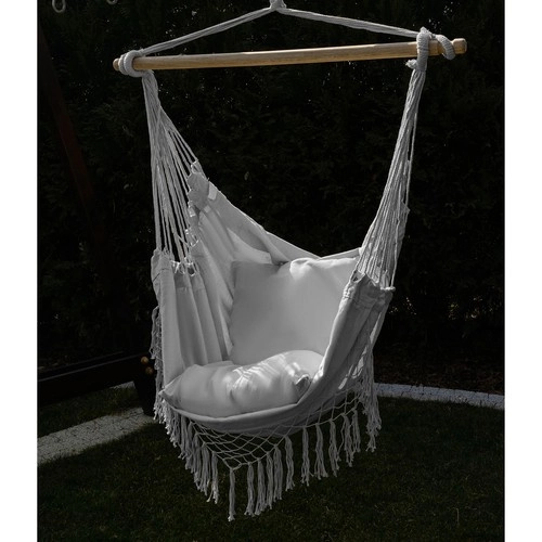 Η ξύλινη αποστατική ράβδος κατανέμει το φορτίο ομοιόμορφα, ώστε η πολυθρόνα να είναι καλά ισορροπημένη και σταθερή. Το ανθεκτικό κρεμαστό σχοινί με κρίκο στήριξης επιτρέπει εύκολη ανάρτηση και ασφαλή χρήση. Στη συσκευασία περιλαμβάνονται 2 μαξιλάρια 40 × 40 cm, που αυξάνουν την άνεση στο κάθισμα.
