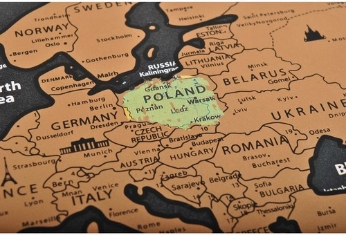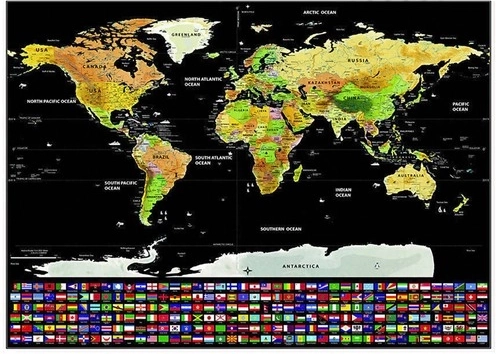 Διακοσμητικός χάρτης που επιτρέπει στους ταξιδιώτες να σημειώνουν τις χώρες που επισκέφθηκαν αφαιρώντας την επάνω στρώση. Από κάτω εμφανίζονται πολύχρωμες σημαίες και λεπτομέρειες κάθε χώρας.