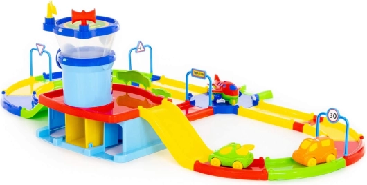Σύστημα πολύχρωμων διαδρομών με γέφυρες, τούνελ και συνδέσεις για οχήματα και αεροπλάνα που εξασφαλίζει ομαλή κίνηση και άπειρα σενάρια παιχνιδιού.