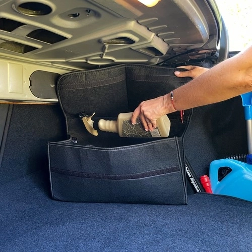 Ο οργανωτής διαθέτει αυτοκόλλητα κουμπώματα τύπου Velcro για σταθερή στερέωση στο πορτμπαγκάζ, αποτρέποντας τη μετακίνησή του κατά την οδήγηση. Χάρη στις ενισχύσεις είναι σταθερός και εύκολα μεταφερόμενος.