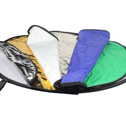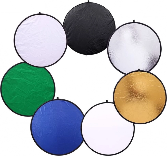 Πολυχρηστικό σετ για διαχείριση φωτισμού: αναδιπλούμενο φωτογραφικό ανακλαστικό 7 σε 1 με διάμετρο 60 cm και ενσωματωμένο διαχυτή. Προσφέρει επιφάνειες χρυσή, ασημένια, λευκή, μαύρη, μπλε, πράσινη και διάχυσης για άψογο έλεγχο ανακλάσεων, θερμοκρασίας και ομοιομορφίας φωτός στο στούντιο και σε εξωτερικούς χώρους. Ελαφρύ, συμπαγές και ανθεκτικό – ιδανικό για επαγγελματίες και αρχάριους.