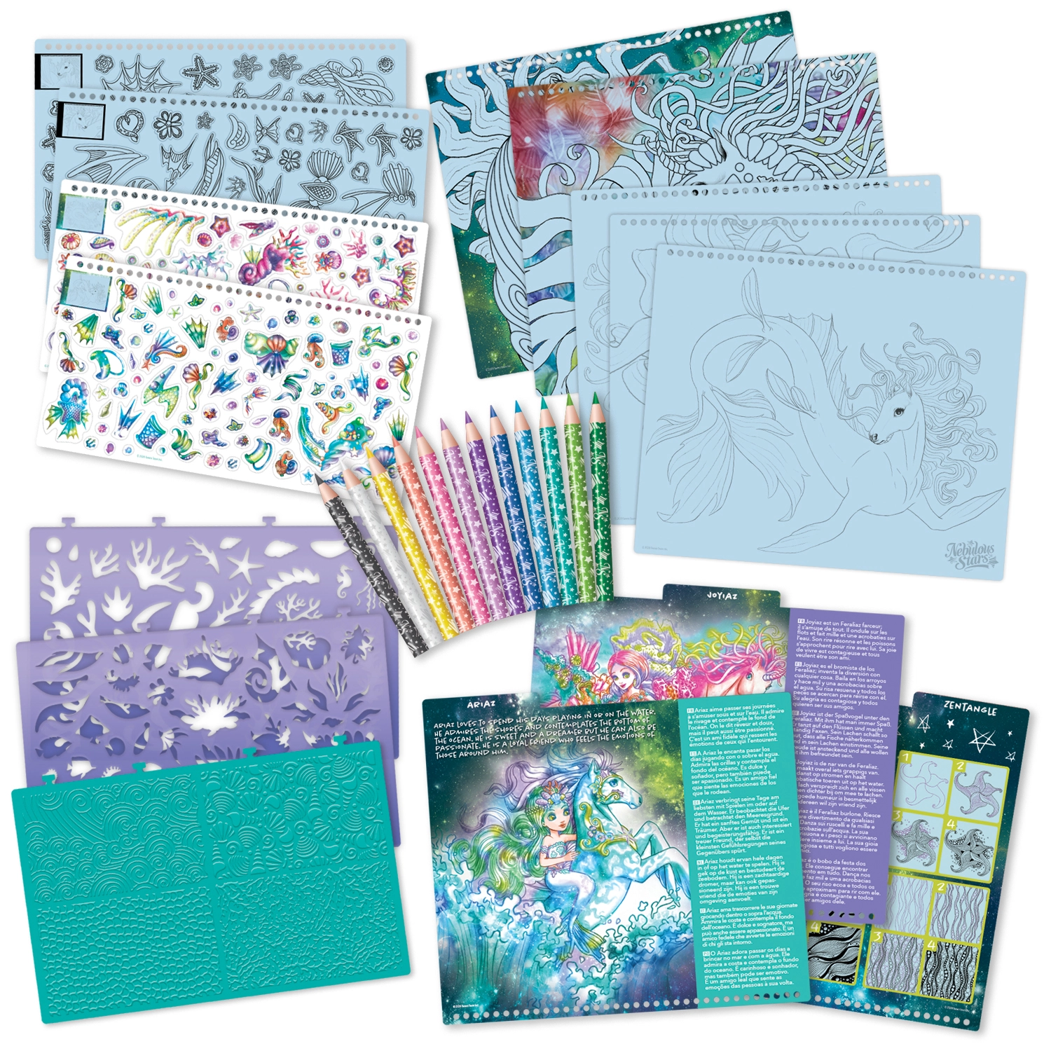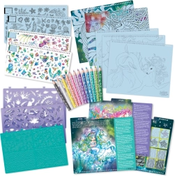 - 250 αυτοκόλλητα, 12 ξυλομπογιές, 80 στένσιλ, 35 φύλλα με εικόνες, 4 πλαστικές φόρμες, οδηγοί για 12 τεχνικές σχεδίασης