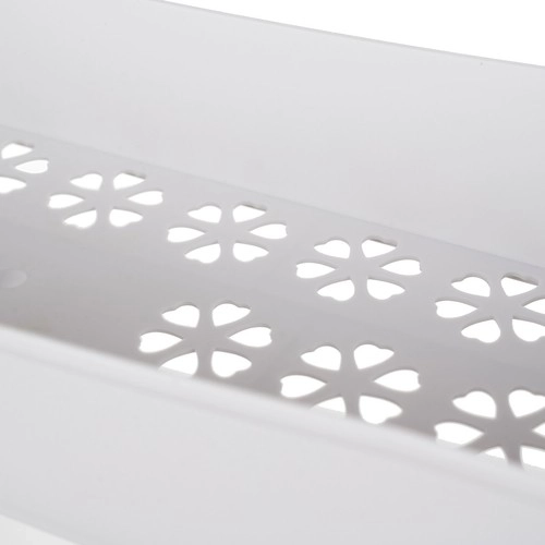 Ο συνδυασμός ακριβών συνδέσεων από ανοξείδωτο ατσάλι και ποιοτικού PP εξασφαλίζει σταθερότητα και μεγάλη διάρκεια ζωής. Ο διάτρητος πάτος των ραφιών με λουλουδάτο μοτίβο όχι μόνο ομορφαίνει τον χώρο, αλλά επίσης βελτιώνει την απομάκρυνση υγρασίας. Τέσσερις περιστρεφόμενες ρόδες επιτρέπουν ομαλές μετακινήσεις ακόμη και σε στενούς χώρους και τα πρακτικά γαντζάκια στα πλάγια κρατούν πετσέτες, σφουγγάρια ή βούρτσες στη θέση τους.