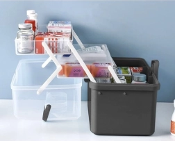 Πρακτικός και ανθεκτικός οργανωτής φαρμάκων με διώροφα, αναδιπλούμενα ράφια και ευρύχωρο κάτω θάλαμο που εξασφαλίζει τάξη σε όλα τα ιατρικά βοηθήματα. Χάρη στο υλικό PP είναι σταθερός, μη τοξικός και εύκολος στον καθαρισμό, το διάφανο καπάκι επιτρέπει γρήγορο έλεγχο του περιεχομένου και το ασφαλές κλείδωμα καπακιού προστατεύει από τυχαίο άνοιγμα. Με εργονομική λαβή για εύκολη μεταφορά είναι ιδανικός για το σπίτι και τα ταξίδια.