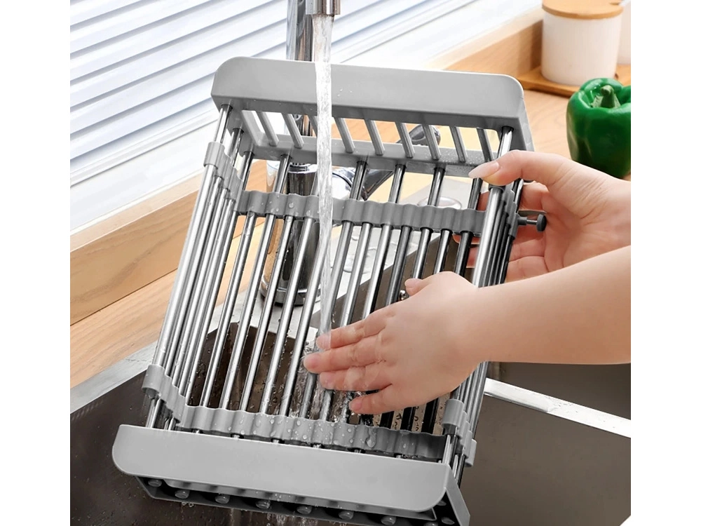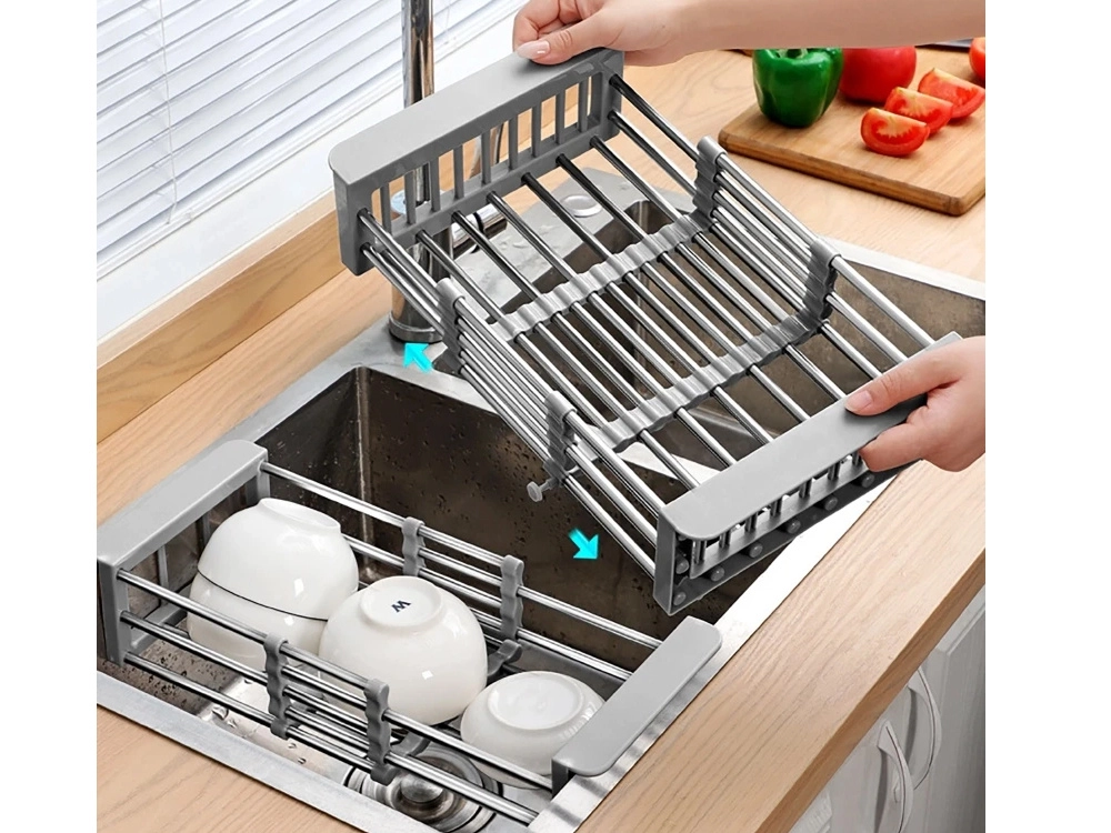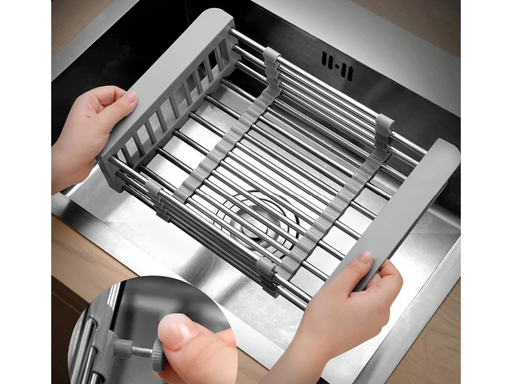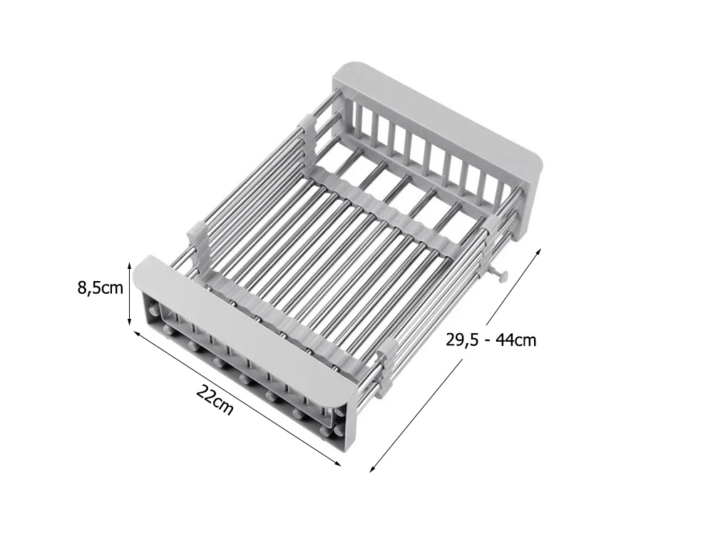 Πρακτικό τηλεσκοπικό στραγγιστήρι για τον νεροχύτη, που προσαρμόζεται ομαλά σε πλάτος 29,5–44 cm. Ιδανικό για πλύσιμο φρούτων και λαχανικών, στράγγισμα σκευών και εξοικονόμηση χώρου στον πάγκο της κουζίνας. Ανθεκτικός συνδυασμός μετάλλου και πλαστικού, εύκολη συντήρηση και μοντέρνο γκρι χρώμα.