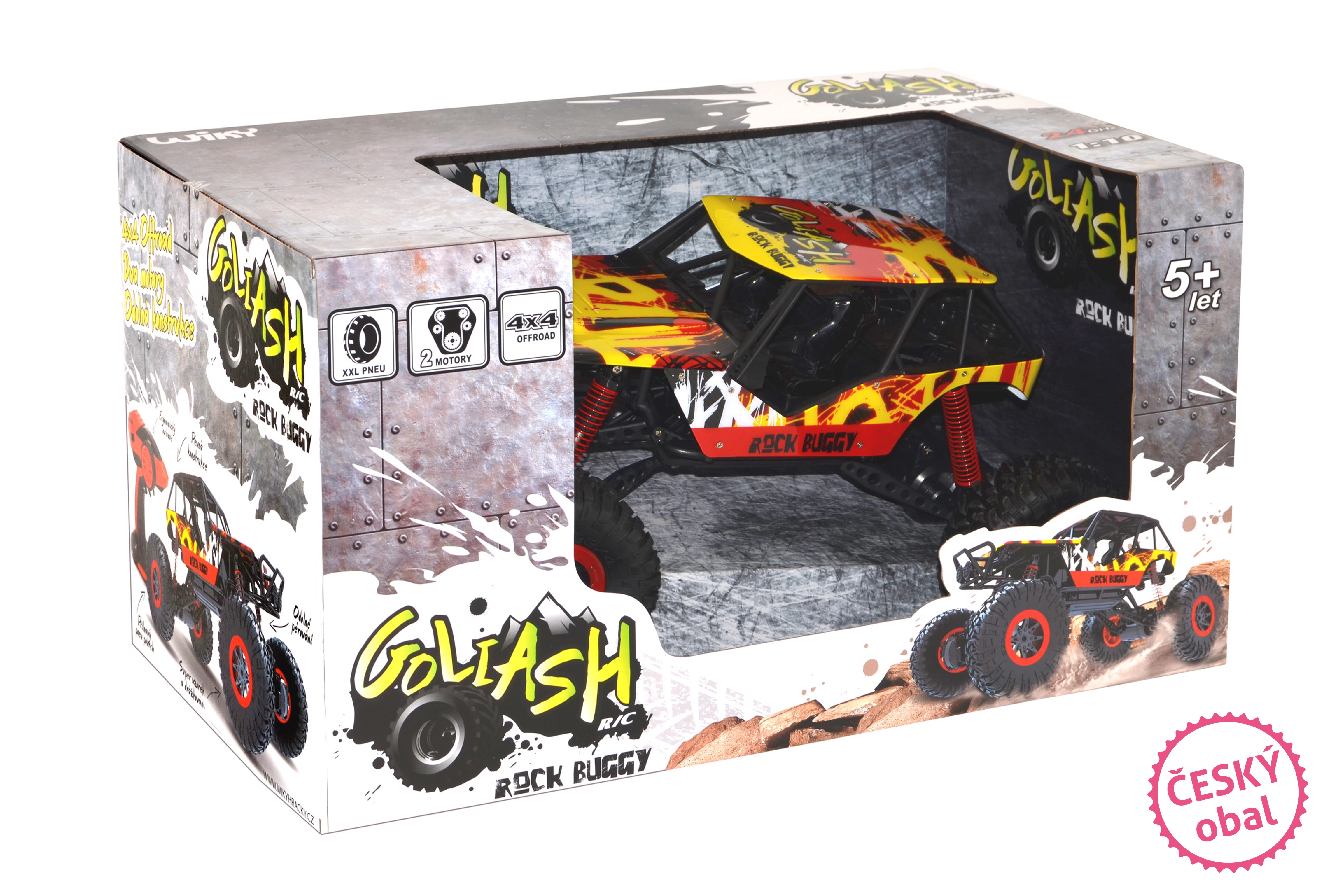 Ο θρυλικός off-road Rock Buggy Goliash είναι φτιαγμένος για να ξεπερνά απαιτητικά εμπόδια. Οι μεγάλες ρόδες με εξαιρετικό πέλμα και αυλακώσεις, οι δύο κινητήρες και η κίνηση και στους τέσσερις τροχούς εξασφαλίζουν ασυναγώνιστη διέλευση σε κάθε έδαφος. Με τη στιβαρή ανάρτηση δεν φοβάται το γρασίδι, τις πέτρες ή τις ανωμαλίες.