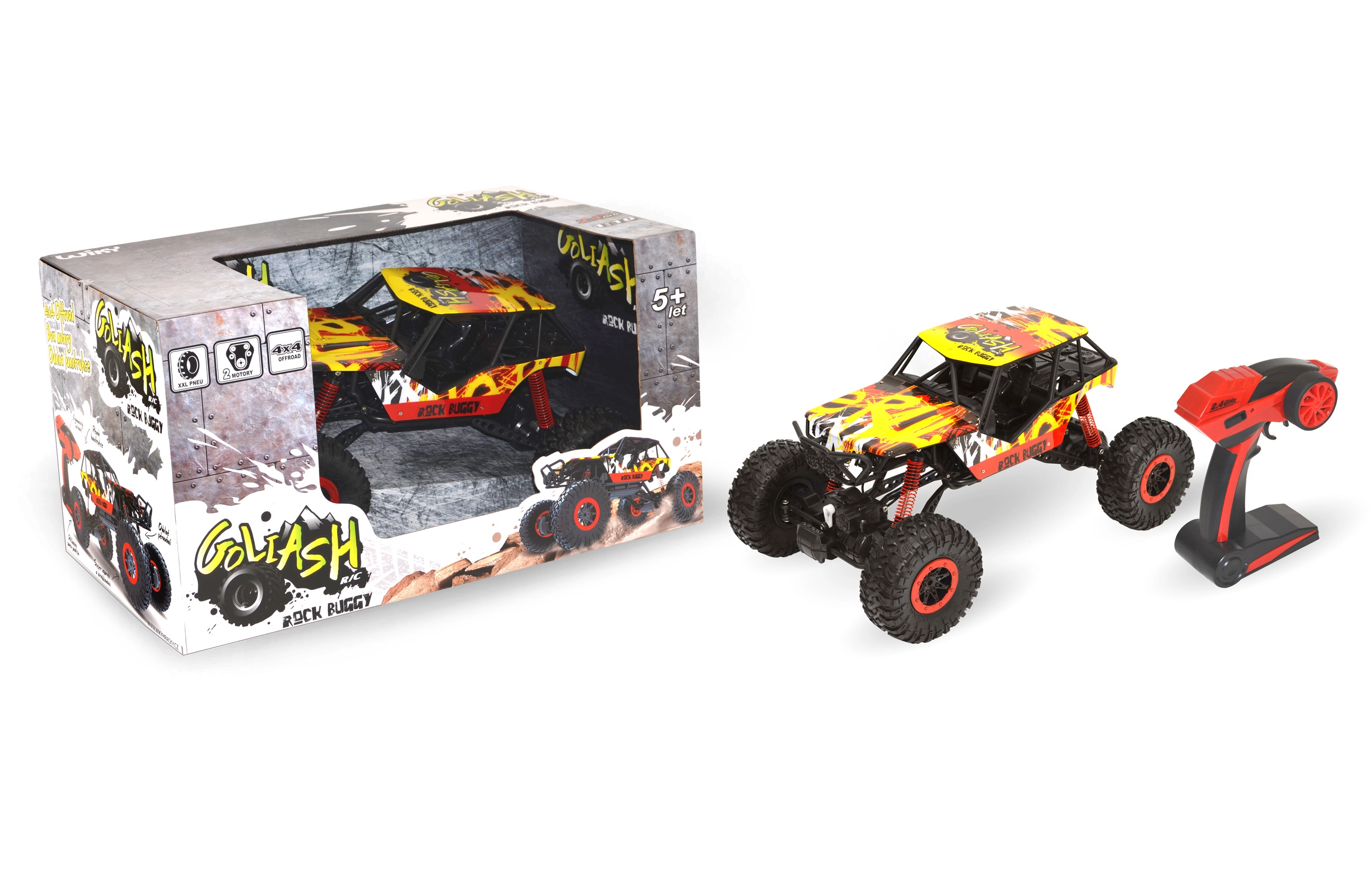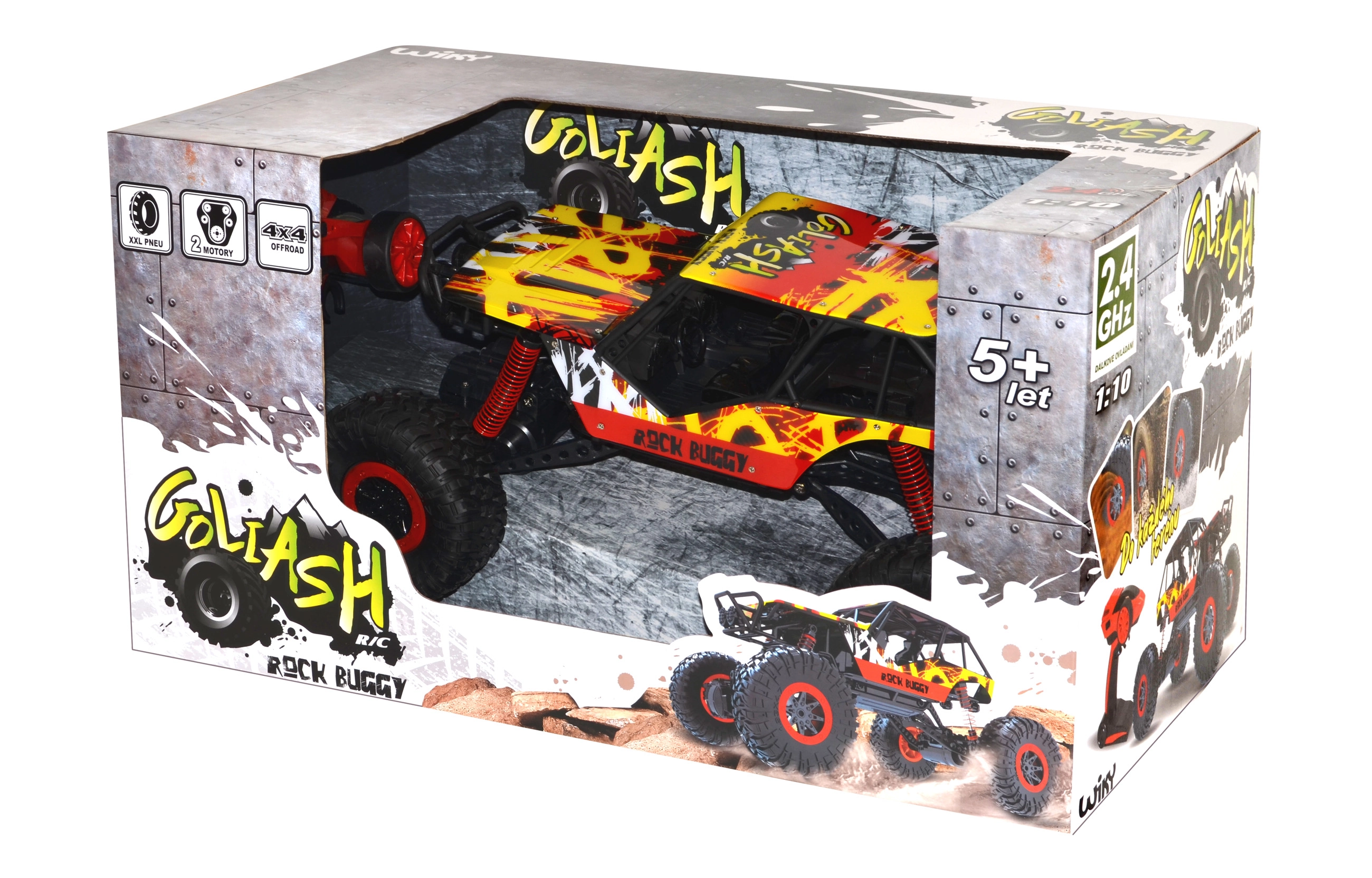 Το τετρακίνητο RC αυτοκίνητο Rock Buggy Goliash ανταποκρίνεται σε κάθε πρόκληση. Χάρη στην κίνηση 4x4, τα XXL ελαστικά με υψηλή πρόσφυση και την ανθεκτική ανάρτηση, τα καταφέρνει σε άμμο, χιόνι και λάσπη. Φτάνει ταχύτητα έως 10 km/h, διαθέτει εμπρόσθια LED φώτα και βελτιωμένο πομπό 2,4 GHz που δεν παρεμβάλλεται με άλλους. Ιδανική επιλογή για μικρούς και μεγάλους εξερευνητές.