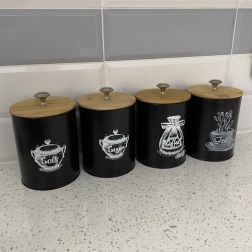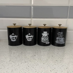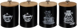 Το σετ περιλαμβάνει τέσσερα δοχεία με ενδείξεις «Αλάτι», «Ζάχαρη», «Τσάι» και «Καφές», βοηθώντας να διατηρείται το περιεχόμενο οργανωμένο και εύκολα προσβάσιμο. Χάρη στη μεταλλική χειρολαβή στο καπάκι, το άνοιγμα και το κλείσιμο των δοχείων είναι απλό και άνετο.