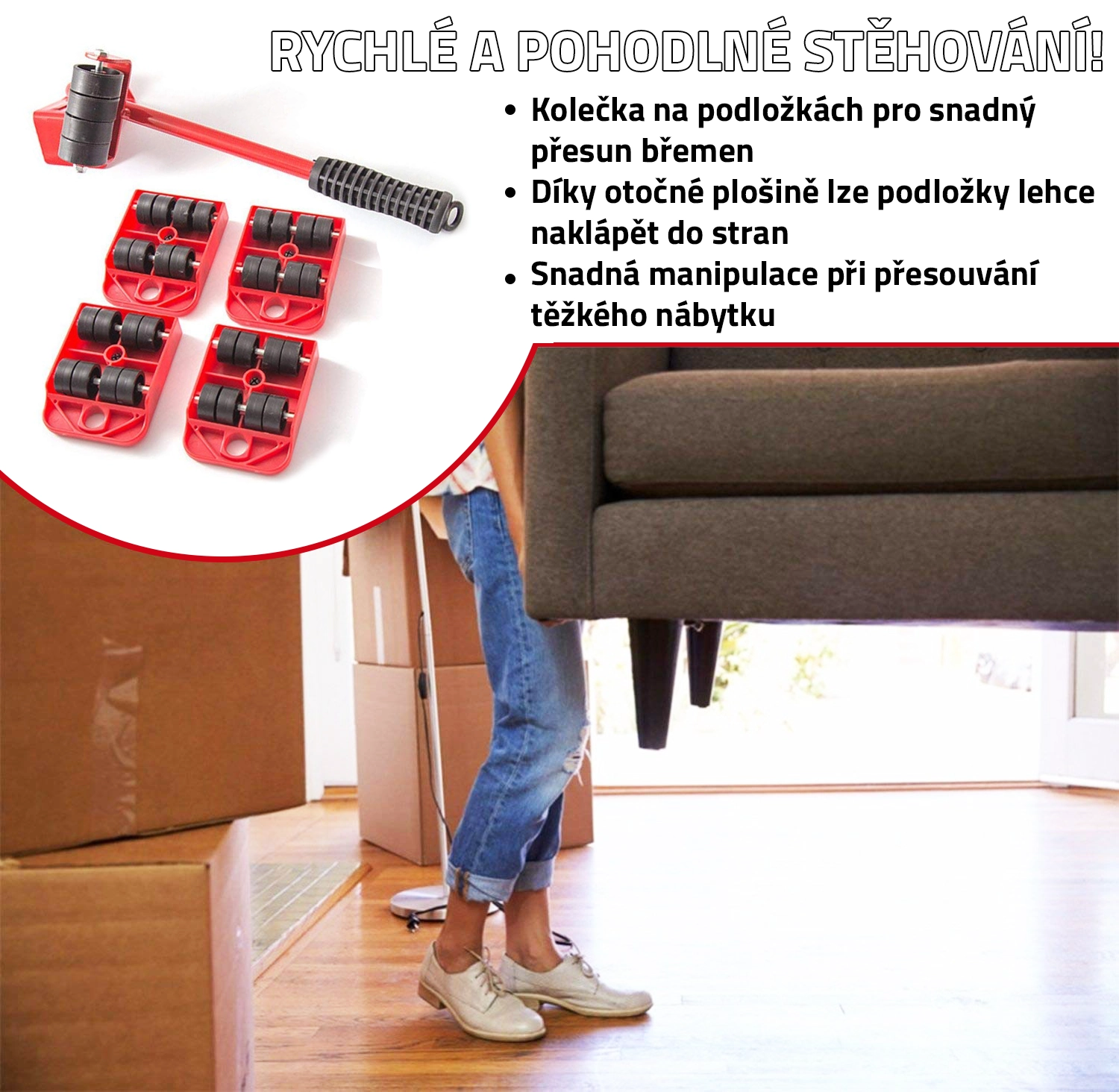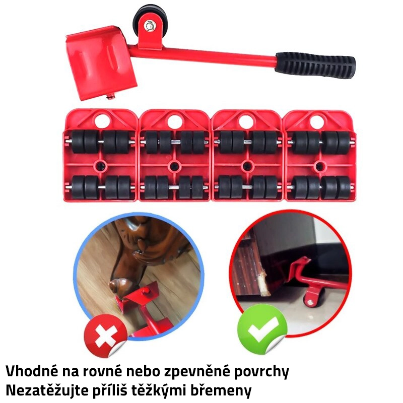 Πρακτικό σετ για εύκολη μετακίνηση βαριών επίπλων και συσκευών έως 150 kg. Περιλαμβάνει μοχλό ανύψωσης για να σηκώνετε τα έπιπλα και τέσσερα μεταφορικά ρολά με αντιολισθητική επιφάνεια και περιστροφή 360°, ώστε να μετακινείτε πλυντήριο, ψυγείο ή συρταριέρα γρήγορα, με ασφάλεια και χωρίς κόπο.