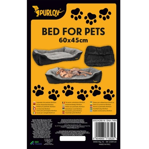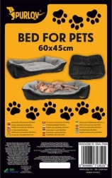 Το κρεβατάκι Purlov σε διάσταση 60 × 45 cm (εξωτερικές 65 × 50 × 13 cm) έχει σχεδιαστεί για άνετο ύπνο μικρών και μεσαίου μεγέθους φυλών. Το απαλό γκρι εσωτερικό και τα ανθεκτικά μαύρα πλαϊνά εξασφαλίζουν άνεση, στήριξη και μεγάλη αντοχή. Χάρη στο χαμηλό ύψος εισόδου, μπορούν να μπουν εύκολα και κουτάβια ή μεγαλύτερα ζώα.