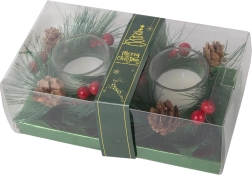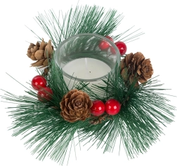 Κομψά γυάλινα κηροπήγια περιβάλλονται από τεχνητά στοιχεία που εξασφαλίζουν ανθεκτικότητα και διαρκή ομορφιά. Ταιριάζουν τέλεια σε κάθε εσωτερικό χώρο, χάρη στην κλασική τους εμφάνιση που συνάδει με την χειμερινή περίοδο.