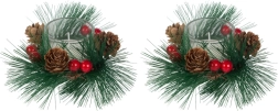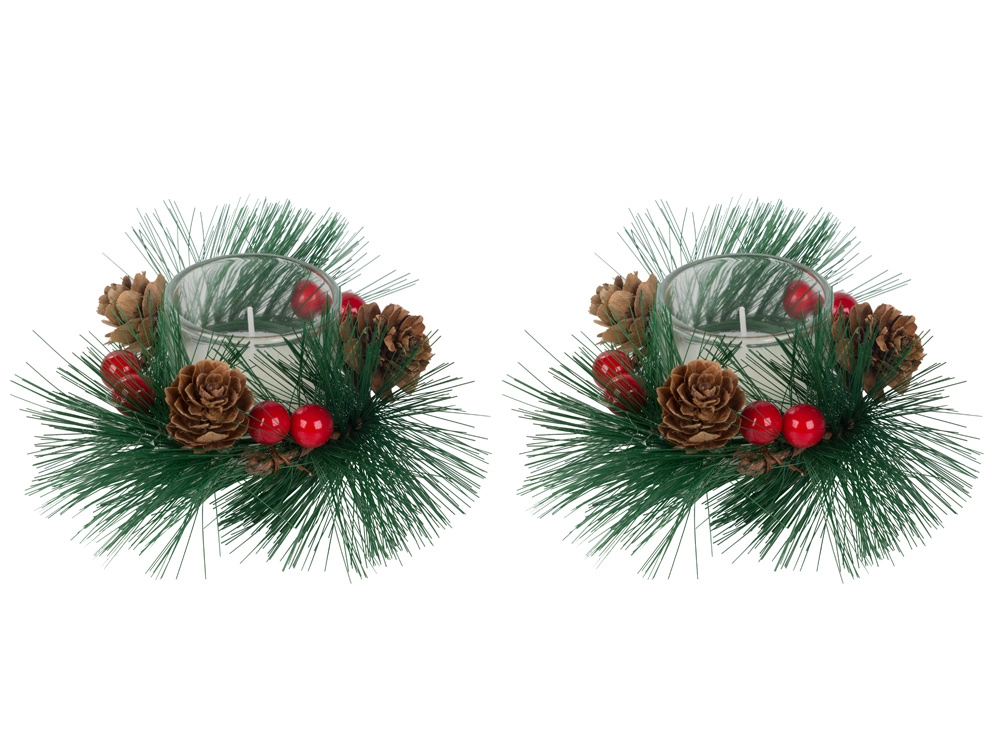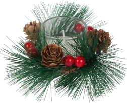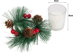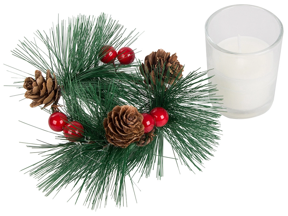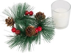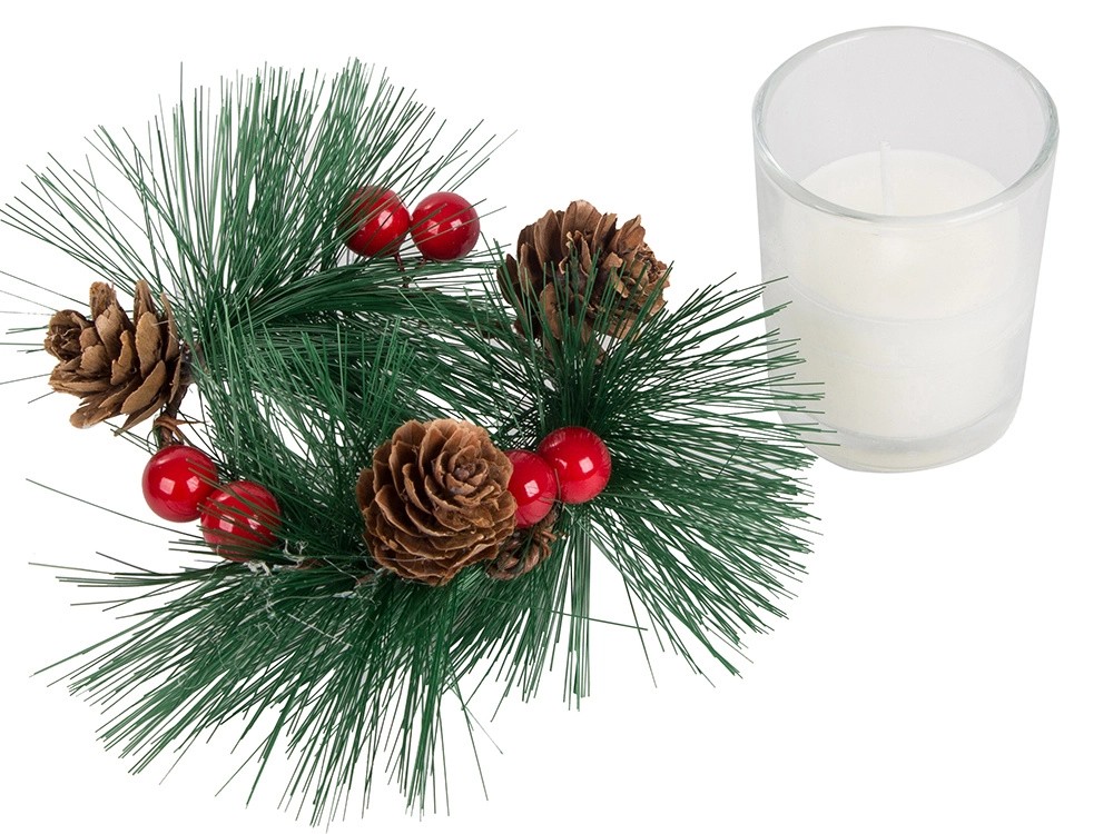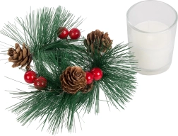 Αυτά τα διακοσμητικά κεριά σε στιλ χριστουγεννιάτικου στεφανιού είναι το ιδανικό συμπλήρωμα για το γιορτινό σας τραπέζι ή ράφι. Κλαδάκια πεύκου, κουκουνάρια και κόκκινα μούρα γύρω από το γυάλινο κηροπήγιο προσθέτουν φυσική χριστουγεννιάτικη μαγεία.